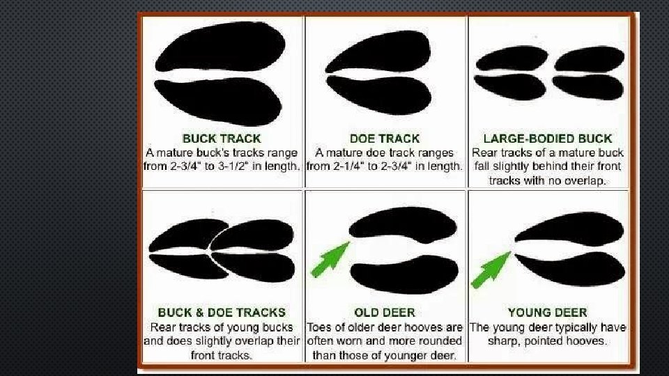 VI. ANIMALS WITH HOOVES • DIRECT REGISTER • DEW CLAWS MAY SHOW • DIAGONAL WALK/ALTERNATING WALKING PATTERN • NARROW END POINTS TO WHERE THEY ARE GOING • DEEPER TRACK WITH HOOVES SPREAD APART = LARGER ANIMAL • ALL TEND TO FOLLOW DAILY PATTERNS – TRAILS