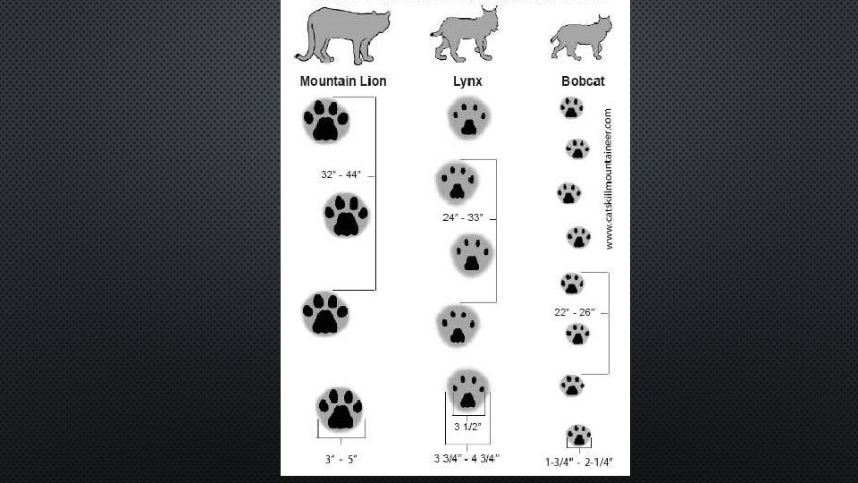 II. CAT FAMILY • A. DIRECT REGISTER –ALTERNATE GAIT • BACK FOOT STEPS IN FRONT FOOT TRACK • B. SPECIES • 1. FERAL CAT • 2. BOBCAT • 3. LYNX • 4. COUGAR