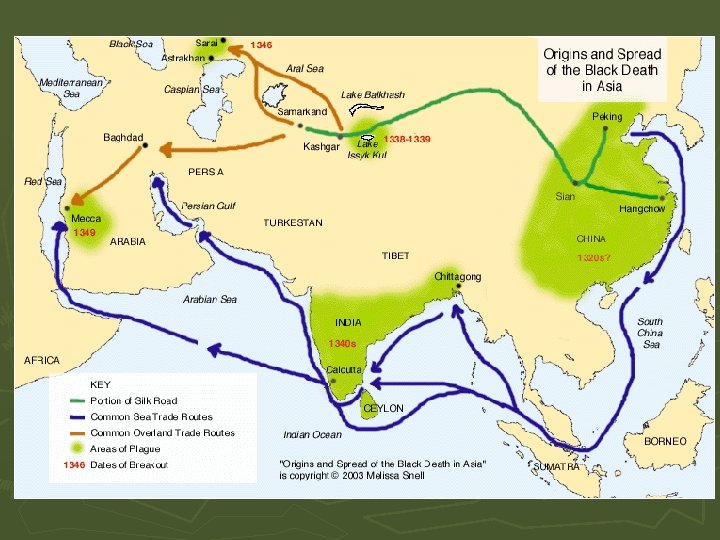 Disease: Bubonic Plague ► During the 1330 s plague erupted in southwestern China ► During the 1340 s, Mongols, merchants, and other travelers helped to spread the disease along trade routes to points west of China ► It thrived in the trading cities of central Asia where domestic animals and rodents provided abundant breeding grounds for fleas and the plague bacillus ► By 1346 it had reached the Black Sea ports of Caffa and Tana