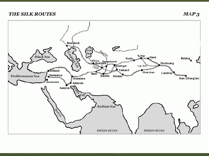 Where did it go? Linked China and the Holy Roman Empire § The two extreme ends of Eurasia ► Started in the Han capital of Chang’an and went west to the Taklamakan Desert § There the road split into two main branches that skirted the desert to the north and south ► ► In northern Iran, the route joined with roads to ports on the Caspian Sea and the Persian Gulf and proceeded to Palmyra (modern Syria) § There it met roads coming from Arabia and ports on the Red Sea ► The Silk Roads also provided access at ports like Guangzhou in southern China that led to maritime routes to India and Ceylon (modern-day Sri Lanka)