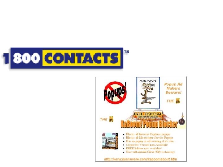 Pop up Ads • Drugstore analogy • How similar to traditional product placement “wars” and tactics? • Reciprocal interaction between “real space” and “cyberspace”