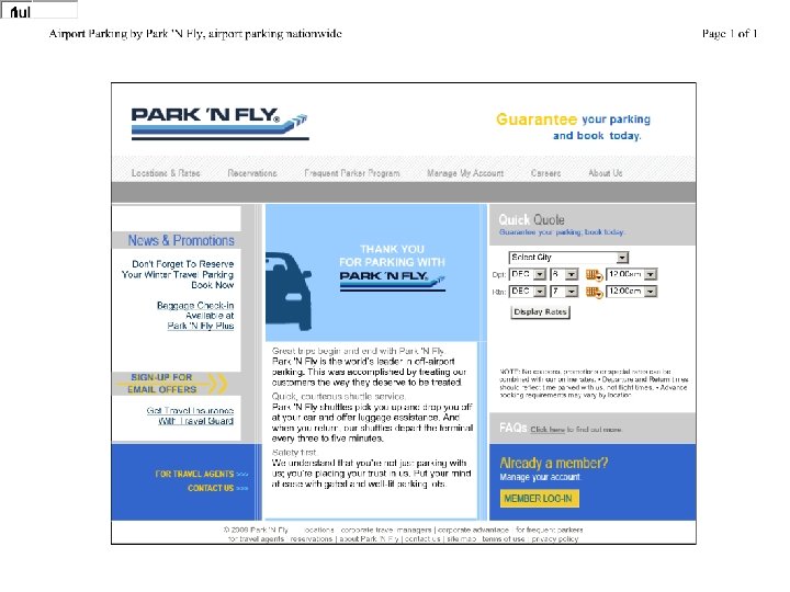 http: //tess 2. uspto. gov/bin/showfi eld? f=doc&state=4009: qvvj 14. 4. 5 Word Mark PARK 'N FLY Goods and Services IC 039. US 105. G & S: VEHICULAR PARKING ADJACENT AIRPORTS Serial Number 73153231 Filing Date December 23, 1977 Registration Number 1111956 Registration Date January 23, 1979 Owner (REGISTRANT) PARK'N FLY, INC. CORPORATION MISSOURI THE PLAZA Live/Dead Indicator LIVE