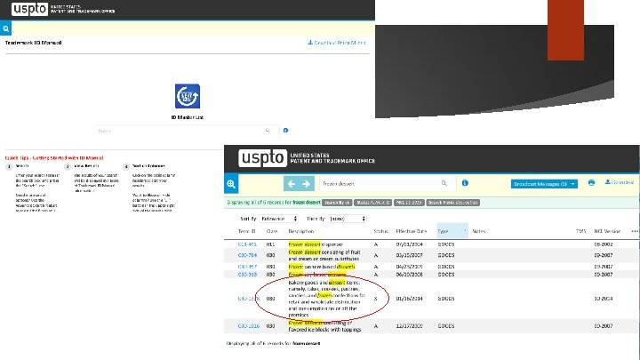 An Example: Zen. Eats ▶ Step 1 : Selecting our mark → Zen. Eats ▶ Our Idea: An ATM for frozen desserts (like the Sprinkles cupcake ATM) ▶ Step 2 : Go to USPTO’s ID Manual, which is a database that includes all goods and services classes and approved descriptions of those goods and services ▶ Goal: search for and select a goods and / or services class that fits our mark