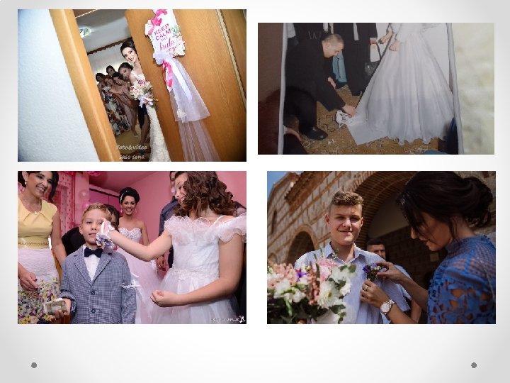 • When they arrive, two girls stay in front of the door and decorate the groom and the godfather with small flowers, man on left and women on right side. • The groomsmen start to bargain with the Bride ‘s family until they agree upon the price. This symbolizes reminiscent of door payments and is a throwback to the day when at the groom literally did buy the Bride – now of course it is just a joke. • One of the bride’s maids puts a ribbon on the best man’s arm and ties it up. The tradition is like a little game where either the boy kisses the bride’s maid or she will give him a small slap on his face, depending on who is faster. • - The brother in law carries the bridal shoes that are one size bigger, he fills shoes with money until they fit well on bride's feet. • When the groom enters the room , he must kiss the bride for three times. • When the couple leaves for the church ceremony the Bride will deliberately kick over a glass of water to symbolize a life as smoothly flowing as the water.