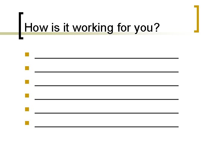 How is it working for you? example n n n Fine at the moment Always room for improvement Often miss the obvious