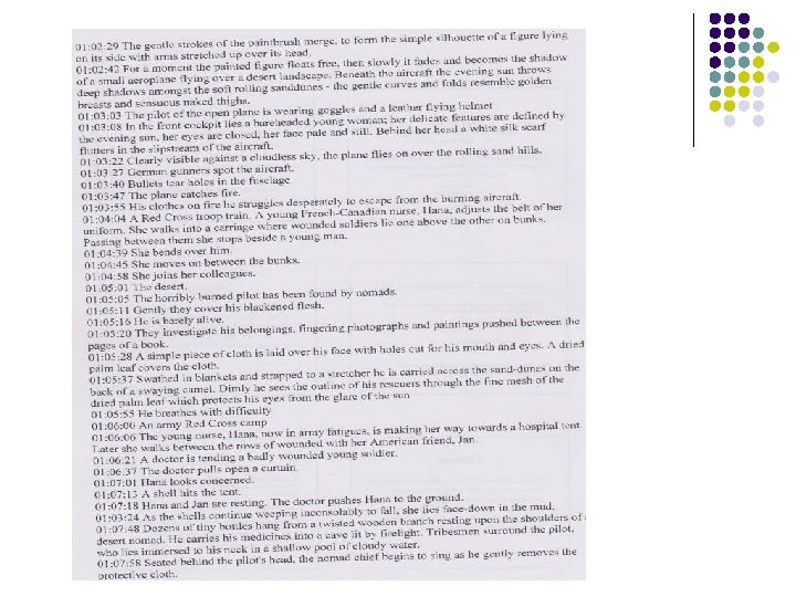 Theme reiteration The English Patient l l l l 01: 04 A Red Cross troop train. A young French-Canadian nurse, Hana, adjusts the belt of her uniform. She walks into a carriage where wounded soldiers lie one above the other on bunks. (Passing between them) she stops beside a young man. 01: 04: 39 She bends over him. 01: 04: 45 She moves on between the bunks. 01: 04: 58 She joins her colleagues.
