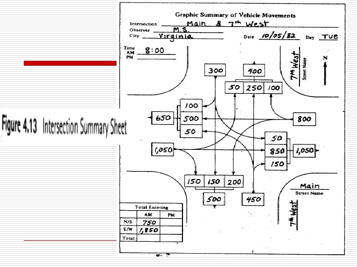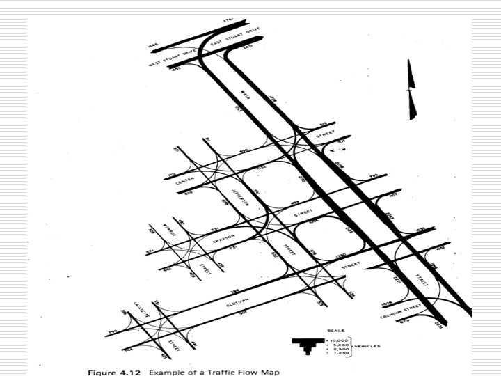 Traffic Volume Data Presentation o 1. 2. 3. 4. Data collected from traffic counts can be presented in several ways depending on the type of counts conducted and primary use of data. Traffic flow maps: n show volumes on individual routes. n The volume of traffic on each route is presented by the width of a band. n See Figure 4. 12 Intersection summary sheet: See Figure 4. 13 Time-Based distribution chart: See Figure 4. 14 Summary Tables: See Table 4. 4