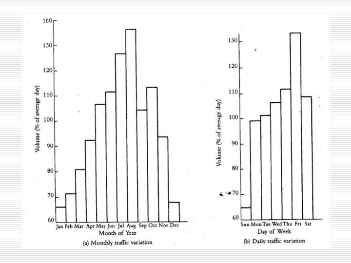 Traffic Volume Characteristics o o o Traffic volume varies from hour to hour, from day to day, and from month to month. It was identified that this variation is repetitive and rhythmic. These characteristics can be used for planning and projections for other time and place, and to estimate the accuracy of traffic counts. See Figure 4. 14 Monthly variations (Fig. 4. 14 a): n Low in Jan. & Feb. because of winter weather. n Peak is during August due to vacation traffic. n This indicate that traffic counts during these two periods can not be representative of the average annual traffic
