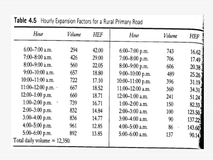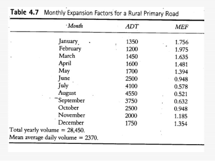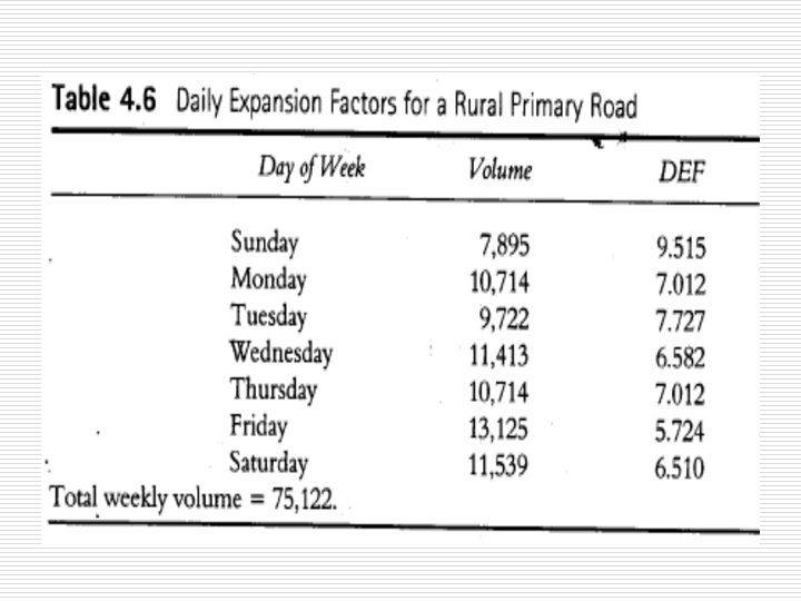 Adjustment of periodic Counts Cont. 2. DEF = (Average total volume for week / Average volume for particular day) o Used to determine weekly volumes from counts of 24 hr duration by multiplying the 24 -hr volume by the DEF. 3. MEF = (AADT / ADT for particular month) o o o The AADT for a given year may be obtained from the ADT for a given month by multiplying this volume bt the MEF. See Table 4. 5 to 4. 7 for examples on expansion factors. See Example 4. 5
