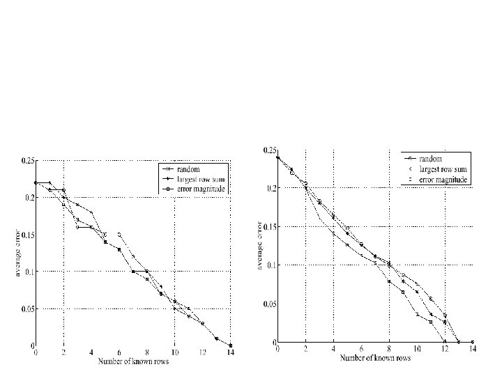 Results: Marginal gains • What improvement could be gained if we could measure some components of the traffic matrix directly? – Carrier may have the option to deploy a certain amount of monitoring equipment • 3 ways to add rows: – Randomly, row-sum (by traffic volume), and error magnitude • Results: – Error rate drops off roughly linearly with each additional row added – Bayesian not sensitive to order rows are added – EM does better when rows added by largest-error first – reduction in adding a row is 2% for 13 OD pairs