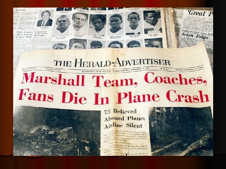 Marshall University - 1970 At 7: 36 p. m. on November 14, 1970, an aircraft crashed into a hill just short of the Tri-State Airport, killing all 75 people on board. The plane was carrying 37 members of the Marshall University Thundering Herd football team, 9 members of the coaching staff, 25 boosters, and 4 flight crew members.