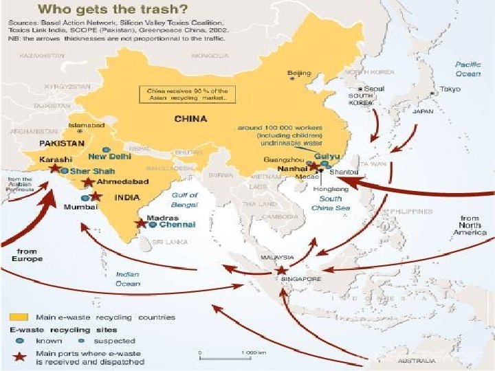 E-WASTE How did the trade evolve? Many countries did not have the capacity to deal with the quantity of e-waste they generated or with its hazardous nature. Began exporting the problem to developing countries where laws to protect workers and the environment are inadequate or not enforced. Cheaper to 'recycle' waste in developing countries. Scrap yards found they could extract valuable substances such as copper, iron, nickel and gold, during the recycling process.