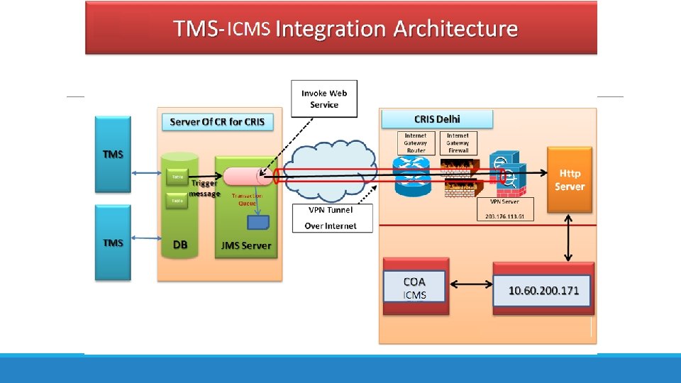 NEED FOR INTEGRATION OF TMS WITH ICMS Scope of TMS is limited to CSTM – KYN section. However, local trains run beyond Kalyan up to Karjat and Kasara. As per contract TMS reports are limited to CSTM- KYN section. Division wanted unified report including section beyond Kalyan by linking TMS data of CSTM-KYN with CRIS server. A separate work was executed for integration of TMS with CRIS server (for CRIS applications of COA, ICMS and NTES). Work scope: Bombardier: Provided TMS real time data for CSTM-Kalyan without any delay on separate server machine in Oracle database. CRIS: To install required software’s (JMS messenger) on separate machine to fetch the real time data from oracle database to CRIS server. Division: To provide WAN connectivity through railnet from TMS Server (Mumbai) to CRIS Server.