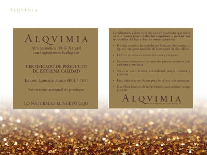 WITHOUT. . . WITH. . . Petroleum derivatives such as mineral oils, parafins and silicons 100% natural composition Sinthetic colouring Floral waters Artificial perfumes Pure essential oils Phormol precursors First expression vegetal oils Solar chemical filters Plant extracts Radiations Natural skin moisturizing agents Honey Natural sun screen factors Natural conservatives and emulsionants