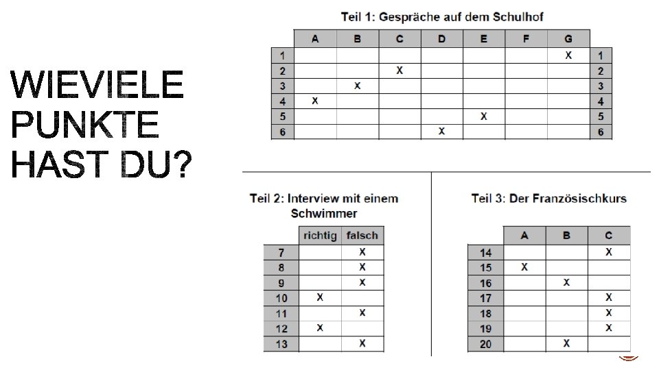 § In Teil 1 gibt es 6 Punkte. § In Teil 2 gibt es 7 Punkte. § In Teil 3 gibt es 7 Punkte. A 2 bekommst du ab 12 Punkten!