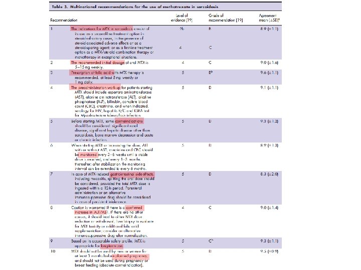 • But: développer des recommandations pour l’utilisation du MTX dans la sarcoïdose • Méthode: – Revue de la littérature – Questionnaire adressé à des experts de la sarcoïdose (250 questionnaires envoyés) – Les informations deux premières étapes sont utilisées pour formuler des recommandations – Les recommandations sont adressées à 17 experts pour finalisation Cremers, J. P. , et al. , Multinational evidence-based World Association of Sarcoidosis and Other Granulomatous Disorders recommendations for the use of methotrexate in sarcoidosis: integrating systematic literature research and expert opinion of sarcoidologists worldwide. Curr Opin Pulm Med, 2013. 19(5): p. 545 -61.
