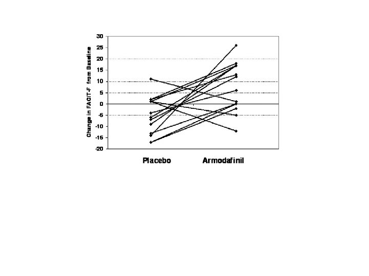 Traitement de la fatigue • Patients avec fatigue persistante sous traitement stable depuis 3 mois • IAH <5, pas de MPJ en nombre significatif • Mesure objective de la somnolence (TILE) • Mesure de la fatigue par des échelles validées • 8 semaines de r-modafinil vs placebo en crossover
