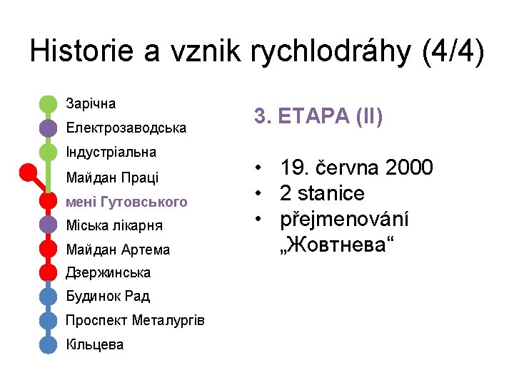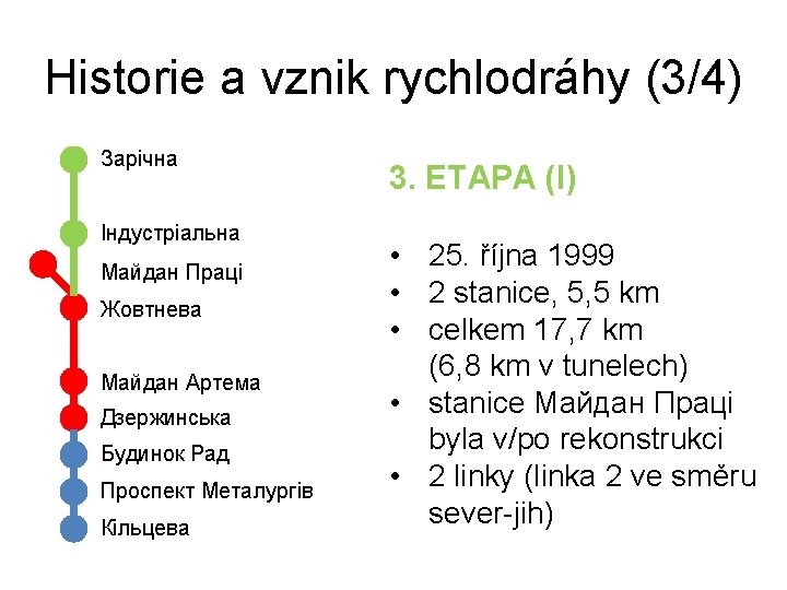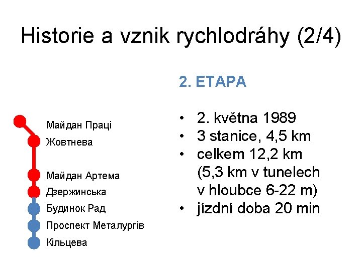 Historie a vznik rychlodráhy (1/4) 1. ETAPA Майдан Праці Жовтнева Майдан Артема Дзержинська • 26. prosince 1986 • 4 stanice, 7, 7 km • koncepce podpovrchové tramvaje • 7 vlaků jako spřažených (jednosměr. ) tramvají T 3 • navrženy obratiště (otáčení souprav)