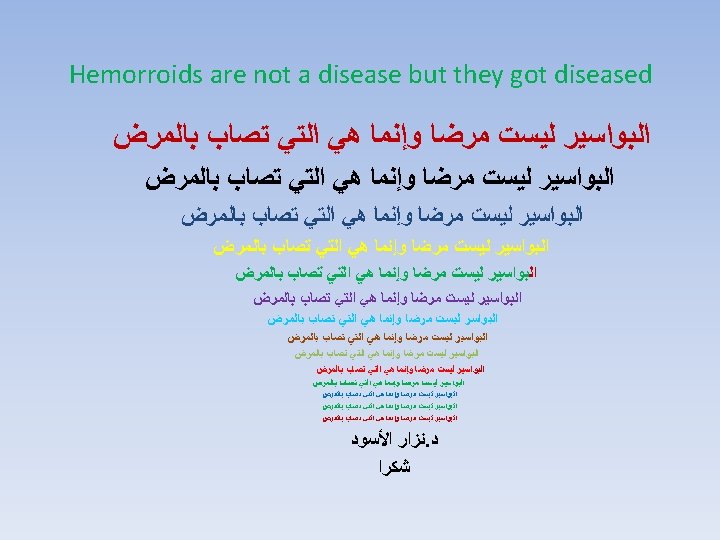 Transanal Hemorrhoidal Dearterialization Hemorroidal Artries ligation T. H. D/ H. A. L A new concepts in hemorroidal surgery ﺍﻟﻌﻼﺝ ﺍﻟﺠﺮﺍﺣﻲ ﻟﻠﺒﻮﺍﺳﻴﺮ ﺍﻟﺠﺪﻳﺪ ﻓﻲ