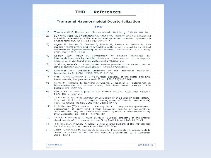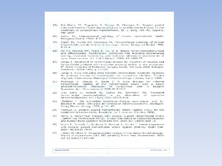• A new method Studies have proved that : Hemorrhoids are important anatomical and physiological structures for continence, that’s why considerable numbers of patients who underwent traditional hemorrhoidectomy develop at least air incontinence. Also coloured-doppler studies have identified six hemorrhoidal branches of the superior rectal artery located in add even numbers , at positions 1, 3, 5, 7, 9 & 11. oclock. ( If observed in lithotomic position ). The procedure is resolutive and pain-free since there is no wounds or cuts. Arterial ligation is above the dentate line. It can be done as day case and the pt can drive his car back to home.