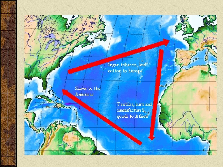 Two main patterns of Triangular Trade Rum from New England to West Africa Slaves to sugar islands Molasses home to the New England distilleries Manufactured goods from England to Africa Goods exchanged for slaves taken to West Indies. Profits used to purchase sugar (and other goods) for England.