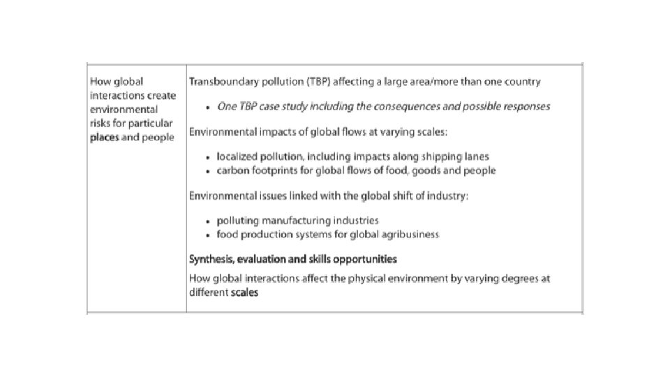 Mark scheme • A transboundary pollution event is one which has damaging effects for more than one country. It is most likely that candidates will analyse a major oil spill or air pollution event. “Event” strongly suggests a single dated occurrence but some credit should still be given to an account of a more pervasive problem (such as acid rain). Thus, for band E, the account must clearly relate to transboundary pollution (thus the pollution type is named, e. g. sulphur dioxide or crude oil; affected states are clearly identified). Further, the temporal aspect should be addressed: if not a single event (e. g. an oil spill) then a period (year or decade) must be identified (giving us a broad interpretation of “event”). An account of acid rain that is not geographically or historically specific should not move beyond band C. If both are there, band E is possible. • It should be made explicit who is affected and why the event is “transboundary”. The consequences may include: immediate ecological and environmental harm; longer clear-up operations; subsequent changes in national and/or international legislature; implications for the polluter (such as poor publicity and “PR nightmare” for TNCs). • The best answers may have a range of varied consequences (such as political / governance response) and will not simply focus on ecological damage. • Pollution events such as the Bhopal incident are not transboundary but may achieve band C if the concept of transnational has been well-explored (idea of TNCs moving their pollution / unsafe operations overseas). The movement of recycling wastes to China may be marked in the same way (it’s hardly an event, but some limited credit for the transboundary / transnational aspects of the case study could be given idea if it has been well-written). • Marks should be allocated according to the markbands.