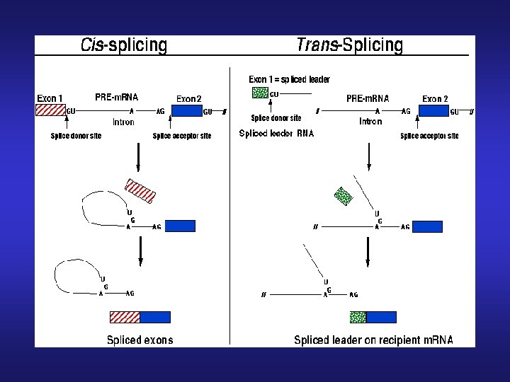 Procesamiento del pre-ARNm / Trans-splicing • Todos los ARNm estudiados comienzan con la misma secuencia de 30 -40 nt -> miniexon (ME - SL) • Esa secuencia no se encuentra en las vecindades del gen que está siendo analizado • Existen 100 -200 genes para ME por núcleo en tandem • c/u está presente en un repetido de aprox 1, 3 kb • Su transcripto presenta Cap 4 (m 7 G, metilaciones 2’OH ribosas 1 -4 y metilaciones en las bases 1 y 4) y es monocistrónico