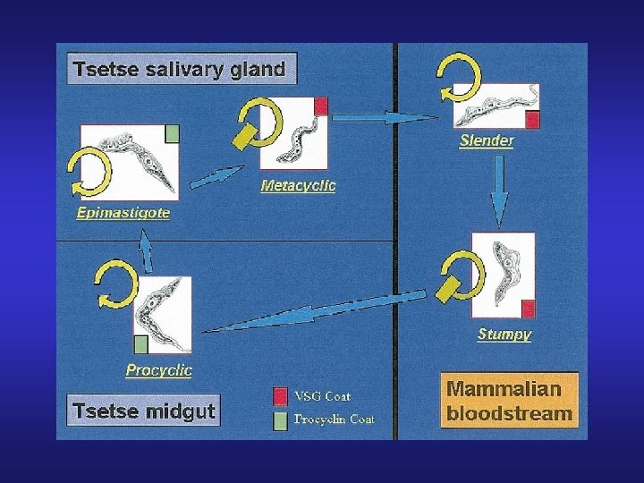 Variant surface glycoprotein (VSG) • Glicoproteínas variables de superficie que constituyen una cubierta densa e inmunogénica de la membrana plasmática ( 107 por organismo) • Son grandes 450 -500 k. Da • Sólo una se expresa por vez • El cambio de expresión de VSG se realiza en forma espontánea (1 cada 100 por generación) • Existen aproximadamente 1000 potenciales variantes por organismo