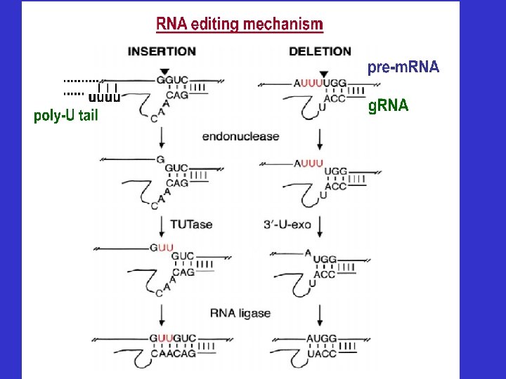 Eucariotas inferiores: - En mitocondrias de Trypanosoma: la citocromo oxidasa sub. II (cox. II) que tiene insertadas 4 U que cambian aminoácidos y además cambia el marco de lectura. Como no existe otro gen, las U fueron agregadas luego de la transcripción - Mecanismo: se encontraron ARN-guías, que contiene una secuencia complementaria del transcripto Acción de la TUTasa usando pool de UTP de la célula Endorribonucleasa y ligasa (ATP)