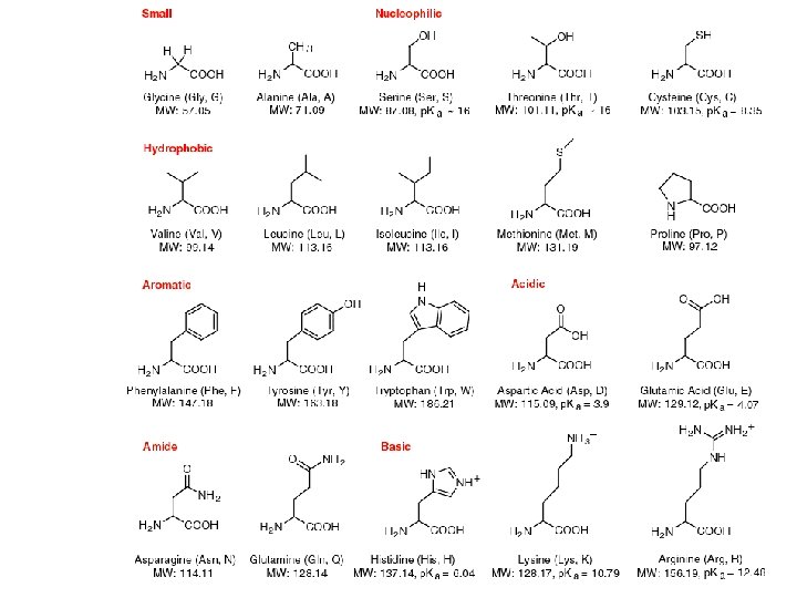 Amino Acids and Peptide Bonds • There are 20 different amino acids coded in DNA. • They all have an amino group ( -NH 2) group on one end, and an acid group (-COOH) on the other end. Attached to the central carbon is an R group, which differs for each of the different amino acids. • When polypeptides are synthesized, the acid group of one amino acid is attached to the amino group of the next amino acid, forming a peptide bond.