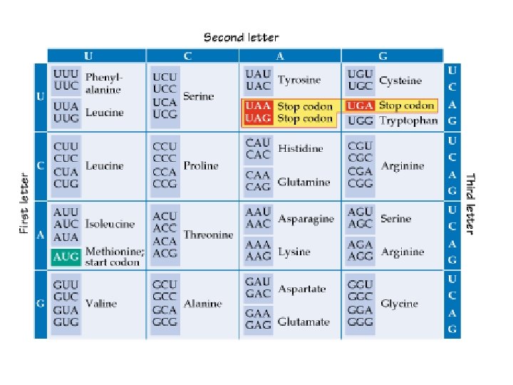 The Genetic Code • Each group of 3 nucleotides on the m. RNA is a codon. Since there are 4 bases, there are 43 = 64 possible codons, which must code for 20 different amino acids. • More than one codon is used for most amino acids: the genetic code is “degenerate”. This means that it is not possible to take a protein sequence and deduce exactly the base sequence of the gene it came from. • In most cases, the third base of the codon (the wobble base) can be altered without changing the amino acid. • AUG is used as the start codon. All proteins are initially translated with methionine in the first position, although it is often removed after translation. There also internal methionines in most proteins, coded by the same AUG codon. • There are 3 stop codons, also called “nonsense” codons. Proteins end in a stop codon, which codes for no amino acid.