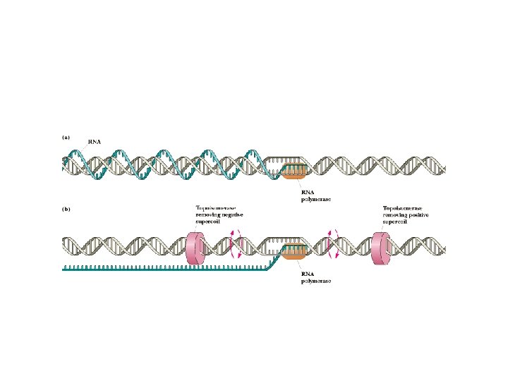 Chain Elongation • • Core polymerase - no sigma Polymerase is accurate - only about 1 error in 10, 000 bases Even this error rate is OK, since many transcripts are made from each gene Elongation rate is 20 -50 bases per second - slower in G/C-rich regions (why? ? ) and faster elsewhere Topoisomerases precede and follow polymerase to relieve supercoiling