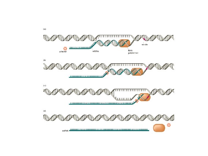 Rho Dependent Termination • rho is an ATPdependent helicase • it moves along RNA transcript, finds the "bubble", unwinds it and releases RNA chain