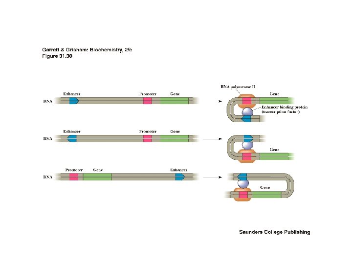 Enhancers • Enhancers are a class of cis-elements that can be located either upstream or downstream of the promoter region (often a long distance away). • Enhancers can also be present within the transcribed region of the gene. • Enhancers can be inverted and still function 5’-ATGC-3’ = 5’-CGTA-3’