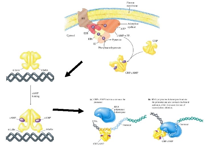 Catabolite Repression of lac Operon (Positive regulation) • When excess glucose is present, the lac operon is repressed even in the presence of lactose. • In the absence of glucose, the lac operon is induced. • Absence of glucose results in the increase synthesis of c. AMP • c. AMP binds to c. AMP regulatory protein (CRP) (AKA CAP). • When activated by c. AMP, CRP binds to lac promoter and stimulates transcription.