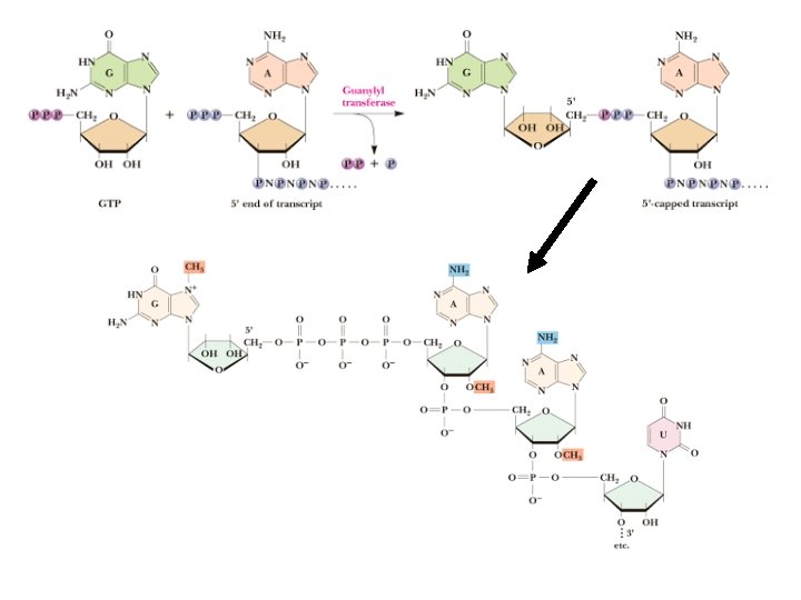 5’ Capping • Primary transcripts (aka pre-m. RNAs or heterogeneous nuclear RNA) are usually first "capped" by a guanylyl group • The reaction is catalyzed by guanylyl transferase • Capping G residue is methylated at 7 -position • Additional methylations occur at 2'-O positions of next two residues and at 6 amino of the first adenine • Modification required to increase m. RNA stability