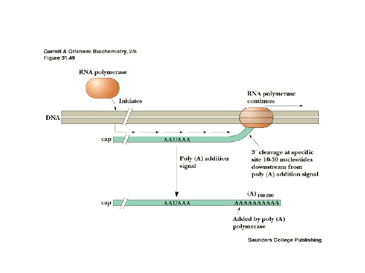 3'-Polyadenylylation • Termination of transcription occurs only after RNA polymerase has transcribed past a consensus AAUAAA sequence the poly(A)+ addition site • 10 -30 nucleotides past this site, a string of 100 to 200 adenine residues are added to the m. RNA transcript - the poly(A)+ tail • poly(A) polymerase adds these A residues • poly(A) tail may govern stability of the m. RNA