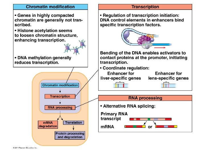 Transcription Initiation: Specific transcription factors (activators or repressors) bind to control elements (enhancer region) Activators: increase transcription Repressors: decrease transcription