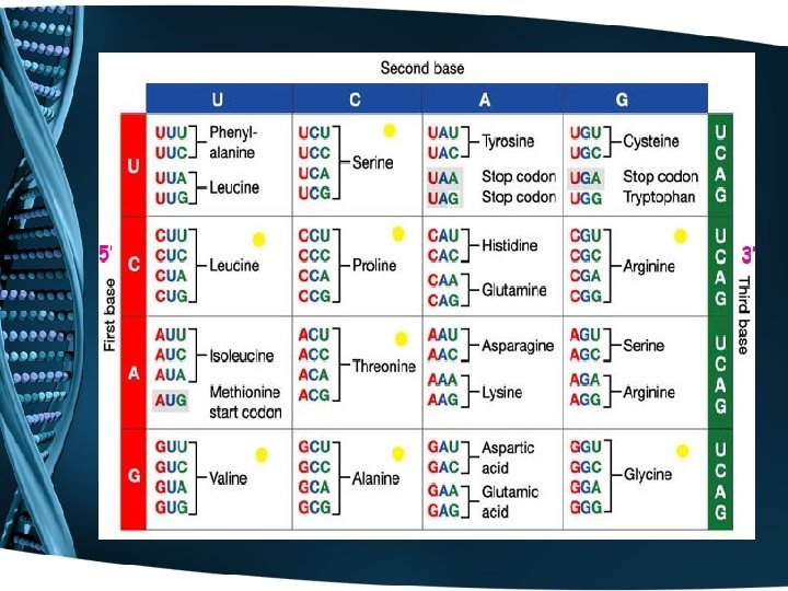 Genetic Code • A certain sequence of Nitrogenous Bases codes for a specific Amino Acid needed to make a Protein • Codon = the nitrogenous bases of 3 adjacent nucleotides in m. RNA that code for – Start Signal (starts the protein making process) – Stop Signal (stops the protein making process) – Amino Acid • An amino acid can be coded for by more than one codon • 20 amino acids combine in different combinations to make various proteins