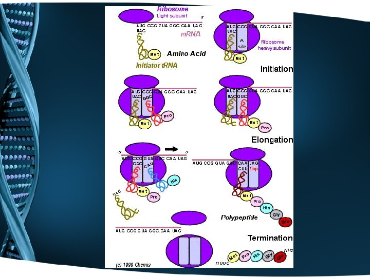 3 Steps of Protein Synthesis 1. Start: Ribosome binds to m. RNA at start codon (AUG) 2. Elongation: 1. t. RNA binds anti-codon to m. RNA codon 2. The ribosome moves from codon to codon along the m. RNA. 3. Amino acids are added one by one 3. Release: release factor binds to the stop codon