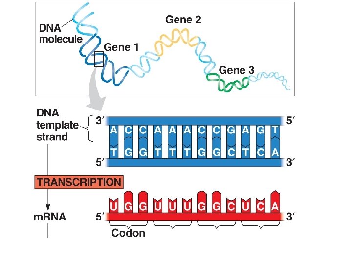 • • • m. RNA is single stranded m. RNA contains no T’s (thymine) It replaces that T’s with U’s (uracil) It can leave the nucleus. It’s base pairs are read it sets of 3 called codons. • A-T-G • U-A-C C-G-G G-C-C T-T-A A-A-U DNA m. RNA