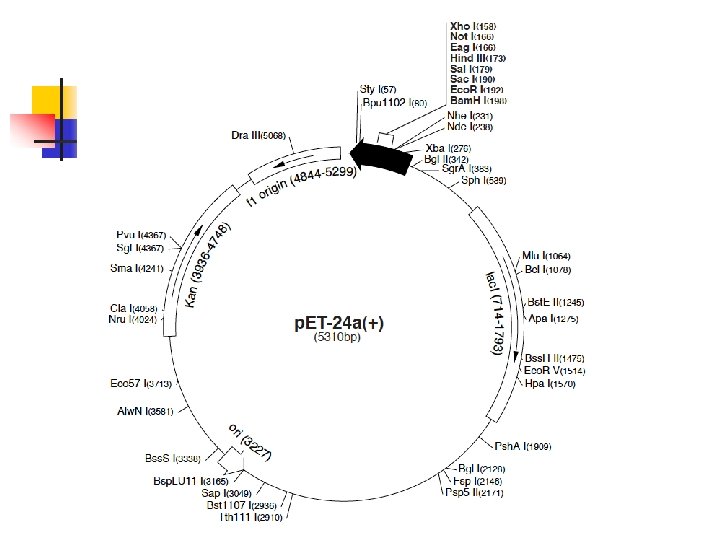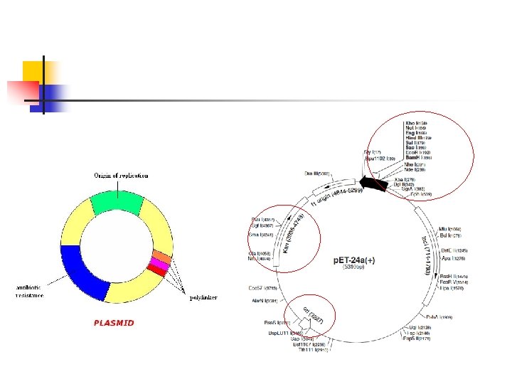 Características 1. ORIGEN DE REPLICACIÓN Capaz de hacer copias exactas de si mismo independiente del cromosoma del hospedero 2. MARCADORES DE SELECCIÓN Permite aislar a las células que poseen el gen deseado, generalmente resistencia a un antibiótico 3. SITIO DE CLONACIÓN MULTIPLE (SCM) Sitios de enzimas de restricción en regiones no esenciales. Permite abrir al plásmido e insertar DNA.