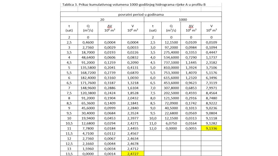 3) Proračun transformacije vodnog vala II) Definiranje početnih uvjeta za transformaciju 1000 godišnjeg vodnog vala Početak transformacije – volumen hidrograma u funkciji vremena • 4, 5 h V=2, 3182 x 106 m 3 • 5 h V=3, 7106 x 106 m 3 Trasformacija započinje u t 1000= 4, 56 h, odnosno 4 h i 34 min Vrijednost ordinate hidrograma, tj. protoka, u trenutku početka transformacije • 4, 5 h Q= 737, 10 m 3/s • 5 h Q= 810, 0 m 3/s Vrijednost protoka u trenutku početka transformacije iznosi Q=741, 12 m 3/s