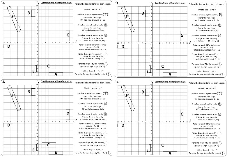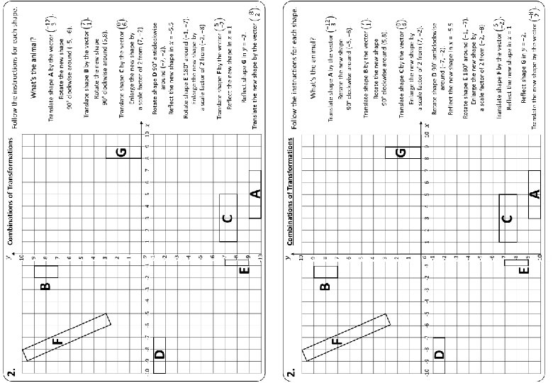 2. Combinations of Transformations F Follow the instructions for each shape. What’s the animal? B B’ F’ G C’ D A’ D’ E’ E G’ Rotate shape E 180° around (− 1, − 7). Enlarge the new shape by a scale factor of 2 from (− 2, − 8) C A