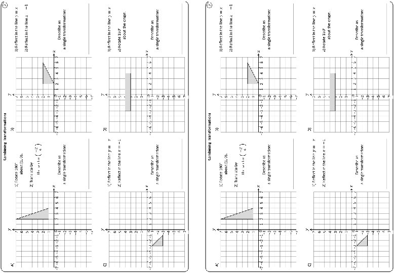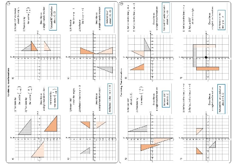 ② Combining Transformations A) B) Describe as a single transformation: Rotated 180° about (0, 2) Rotated 90° anticlockwise about (− 1, − 1) C) D) Describe as a single transformation: Rotated 90° anticlockwise about (− 1, 1) Describe as a single transformation: