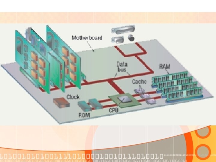 Motherboard • Rigid, rectangular card containing the circuitry that connects the processor to the other hardware. • PCB (Printed Circuit Board) made of Fiberglass sheet with electrical pathways, called traces, etched into it • System Clock (paces the computer) • Microprocessor • Read-Only Memory (ROM) • Random Access Memory (RAM) • Battery • Power Supply • Ports • Expansion Slots • Buses • Address Bus • Data Bus