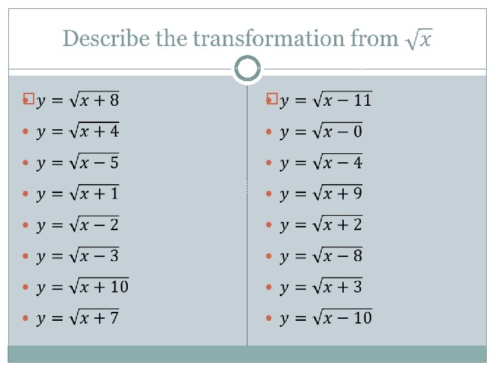 Expert #1: Horizontal Shifts Shrink / stretch factor horizontal shift vertical shift � When we add a number inside the square root, we shift left � When we subtract a number inside the square root, we shift right