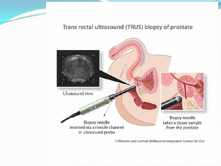 TRUS Biopsy TRUS biopsy complications: False negative rate Haematospermia - 37. 4% Haematuria > 1 day 14. 5% Rectal bleeding < 2 days 2. 2% Prostatitis 1. 0% Fever > 38. 5°C (101. 3°F) 1 – 6% Epididymitis 0. 7% Rectal bleeding > 2 days ± requiring surgical intervention 0. 7% Urinary retention 0. 2% (up to 4. 6%) Other complications requiring hospitalisation 0. 3% Quote own department figures