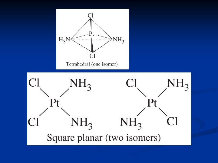 Structure of Compounds Composition Pt. Cl 2. 4 NH 3 2 Cl- # ions Modern formulation 3 [Pt(NH 3)4]2+ Pt. Cl 2. 3 NH 3 2 [Pt. Cl(NH 3)3]+Cl. Pt. Cl 2. 2 NH 3 0 [Pt. Cl 2 (NH 3)2] (2 forms)
