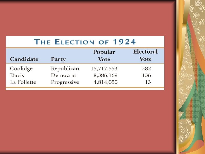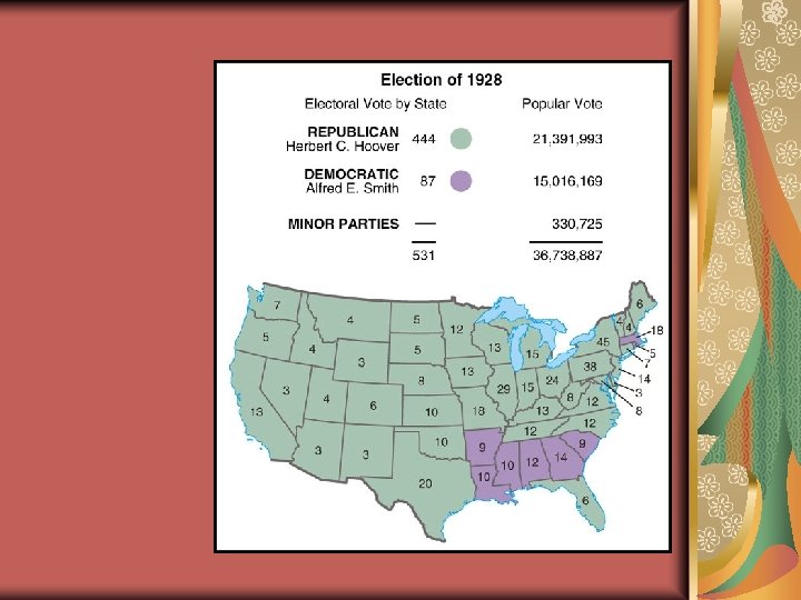 The Election of 1928 Democrat Al Smith carries urban vote governor of New York Roman Catholic Republican Herbert Hoover wins race Midwesterner Protestant Religion the campaign’s decisive issue